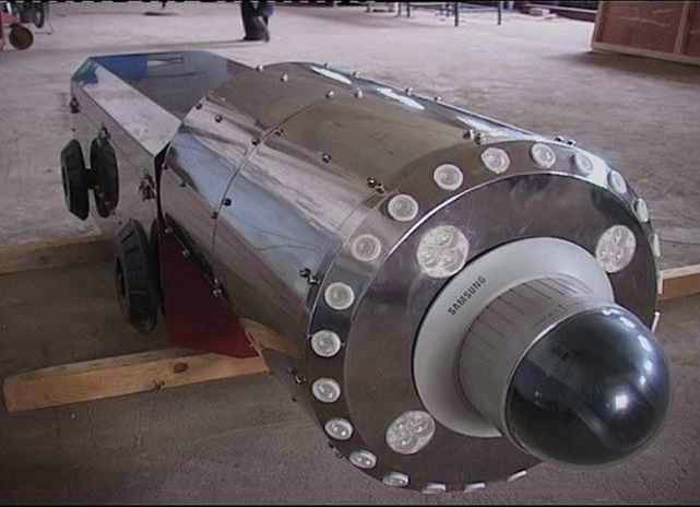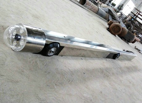 管道內(nèi)觀察機(jī)是一臺(tái)機(jī)、電、訊、光一體化的自動(dòng)觀察作業(yè)小車,包括攝像觀察機(jī)頭和機(jī)身兩大部分。機(jī)頭分為旋轉(zhuǎn)和固定兩部分。機(jī)身包括變徑調(diào)節(jié)機(jī)構(gòu)、機(jī)載收發(fā)信號(hào)系統(tǒng)、機(jī)載控制系統(tǒng)、蓄電池組和驅(qū)動(dòng)行走機(jī)構(gòu)。機(jī)頭旋轉(zhuǎn)部分內(nèi)裝攝像機(jī)和云臺(tái),由電機(jī)帶動(dòng)可向右擺動(dòng)90度。機(jī)頭固定部分內(nèi)裝電機(jī)及傳動(dòng)機(jī)構(gòu),能帶動(dòng)機(jī)頭旋轉(zhuǎn)部分轉(zhuǎn)動(dòng)360度。機(jī)身前端通過燕尾式插槽、插板與機(jī)頭連接成一體。變徑調(diào)節(jié)機(jī)構(gòu)采用燕尾滑板、滑道結(jié)構(gòu),用絲杠、絲母調(diào)節(jié)機(jī)頭上、下移動(dòng)處于管道中心。驅(qū)動(dòng)行走機(jī)構(gòu)在機(jī)身后部,其余在機(jī)身前部和中部。主要用來觀察管道焊縫內(nèi)表面缺陷和管內(nèi)有無(wú)異物及施工質(zhì)量有無(wú)問題,以便及時(shí)處理。